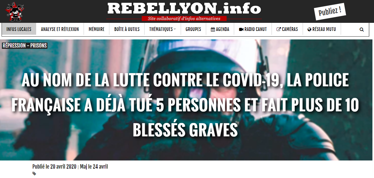 Cinq personnes sont mortes en France entre le 8 et le 15 avril dans le cadre de contrôles policiers, à Béziers, Cambrai, Angoulême, Rouen et La Courneuve. Le calcul a été réalisé par le site militant lyonnais Rebellyon, qui fait le lien avec le confinement. Si chacune de ces morts a été traitée dans les médias, principalement régionaux (Rebellyon se base d'ailleurs sur la presse locale pour effectuer son comptage), la hausse importante de ce type de décès depuis le début du confinement n'a été relevée, à la connaissance d'Arrêt sur images, par aucun média "mainstream".