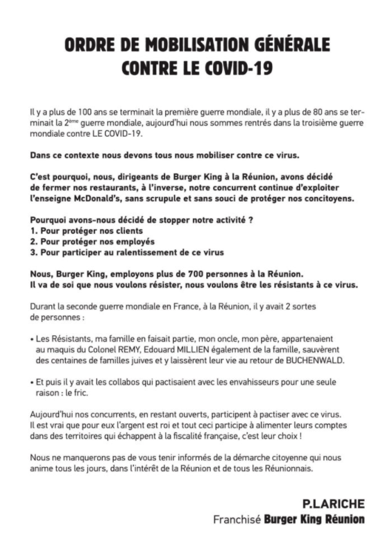 mardi 17 mars 2020. Les restaurants et fast-foods sont autorisés à faire de la vente à emporter, mais dès le mercredi 18 mars, le patron de la franchise Burger King Réunion, Philippe Lariche, décide de fermer complètement ses restaurants pour contrer la propagation du virus. Il va plus loin : le jeudi 19 mars, il fait publier en pleine page un communiqué furieux dans le Journal de l'île de la Réunion