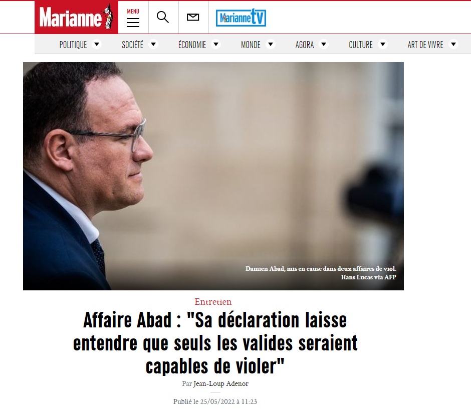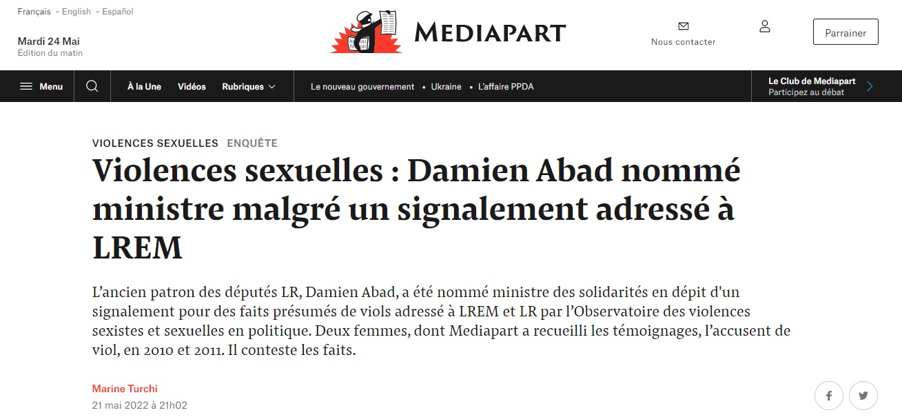 a révélé le 21 mai que deux femmes accusent le nouveau ministre Damien Abad de les avoir violées, respectivement en 2010 et 2011. L'une d'elles, Margaux, a déposé plainte pour viol contre lui en 2017, après avoir abandonné sa démarche de plainte en 2012. Damien Abad, transfuge récent de LR à la majorité présidentielle, a été nommé ministre des Solidarités, de l'autonomie et des personnes handicapées. Il est lui-même atteint d'une maladie congénitale rare, l'arthrogrypose, qui provoque des déformations, des raideurs articulaires, et handicape ses mouvements.