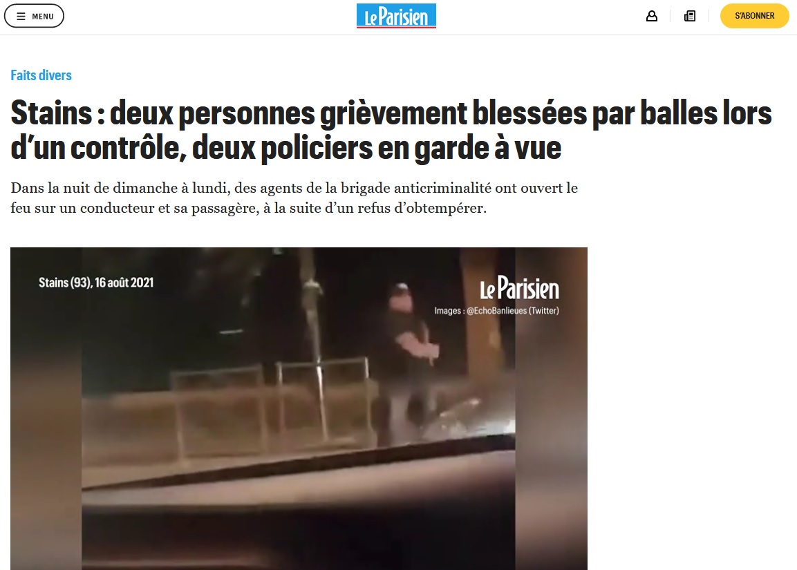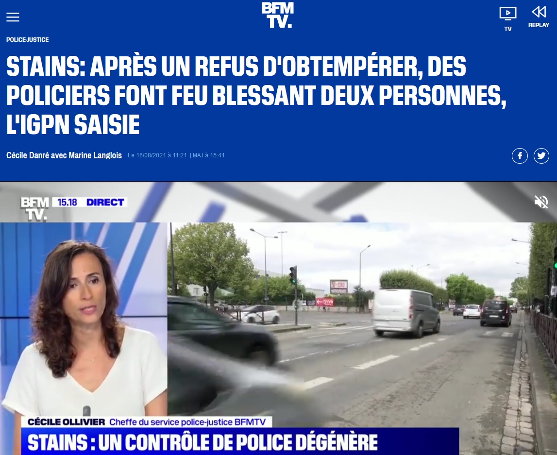 Le "journalisme de préfecture", expression désormais consacrée pour désigner ceux qui oublieraient toute distance avec leurs sources officielles, a-t-il encore frappé avec l'affaire de Stains ? Dans la nuit du dimanche 15 au lundi 16 août 2021, une vidéo amateur est mise en ligne sur Instagram et sur Twitter. L'on peut y voir trois hommes habillés en tenue civile, sans brassard ni gyrophare, autour d'une voiture qui recule, puis avance. Deux d'entre eux tirent alors à quatre ou cinq reprises, la voiture s'arrête, puis avance encore de quelques centimètres. Ils tirent alors de nouveau, à trois reprises, alors qu'ils sont sur le côté de la voiture. Les médias vont traiter l'affaire toute la journée. Mais pas tous de la même manière.