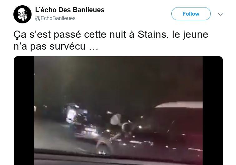 Au petit matin du lundi 16 août, elle est relayée sur Twitter par le média social L'Écho des Banlieues, lancé il y a quatre ans, aujourd'hui animé par quinze vidéastes et photographes. Il accompagne la vidéo du texte suivant : "Ça s'est passé cette nuit à Stains, le jeune n'a pas survécu..." Dans les heures qui suivent, elle est supprimée sans autre forme de procès par L'Écho des Banlieues. Pourquoi ? Car le conducteur n'est pas mort mais grièvement blessé (comme sa passagère), a expliqué à Arrêt sur images son fondateur, le journaliste Eric Arnold Nguenti. "Les trois témoignages obtenus [par L'Écho des Banlieues] à Stains étaient erronés", détaille-t-il. Très partagé, ce relais initial fait prendre un écho considérable à la vidéo – L'Écho des Banlieues est d'ailleurs ensuite cité comme ayant révélé cette vidéo par Mediapart, Marianne, Le Parisien et l'AFP.