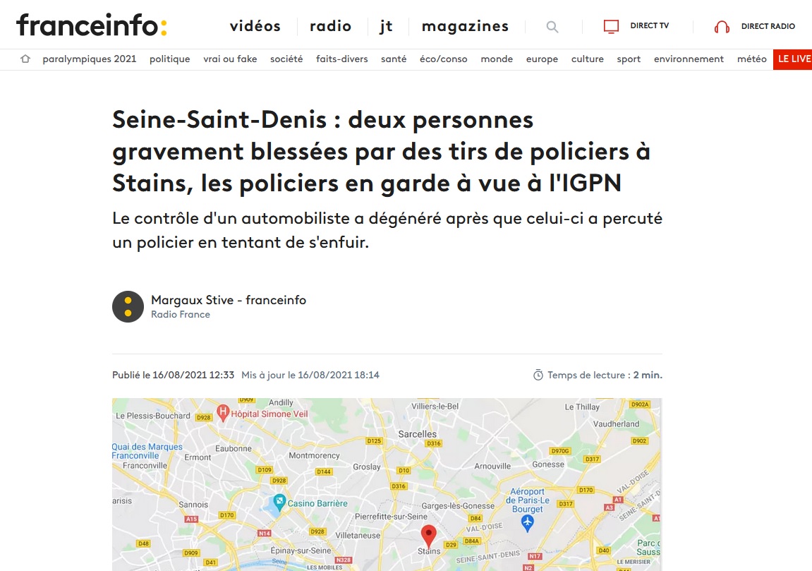 Même attribution à une "source proche de l'enquête" pour l'AFP, dont la première dépêche (publiée par Le Figaro, entre autres) tombe à 13 h 30 ce 16 août, proposant un récit proche des autres articles publiés jusqu'à ce moment-là, et donc du discours de la Préfecture de police. "Une vidéo amateur, diffusée et largement partagée sur les réseaux sociaux, montre les deux agents faire ensuite feu à plusieurs reprises sur la voiture, avec leur arme de service", se contente de préciser l'agence de presse en fin de dépêche – sollicitée, l'AFP n'a pas pu nous répondre dans les délais impartis à publication. Il faut ensuite attendre la fin de soirée pour que l'AFP ajoute enfin, dans une troisième dépêche, une mention de l'absence d'identification, en citant le communiqué du maire de Stains.