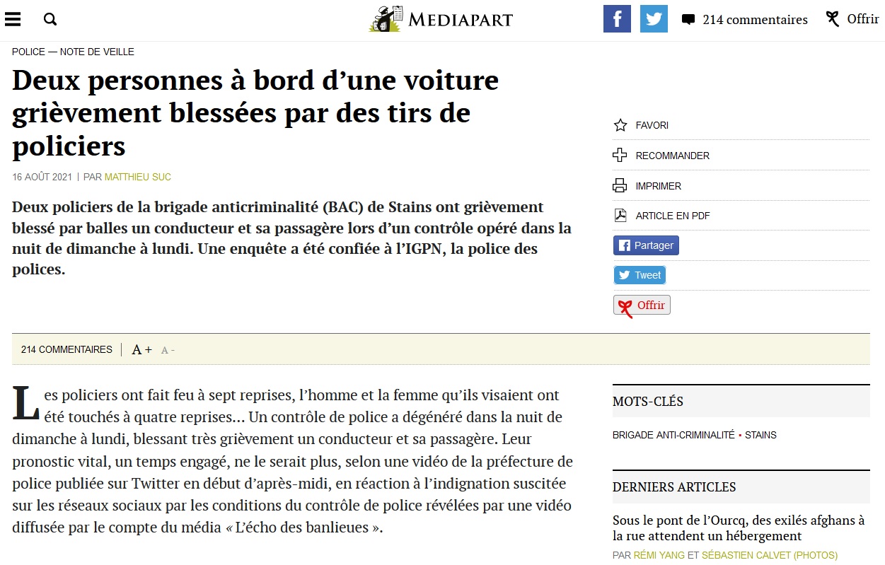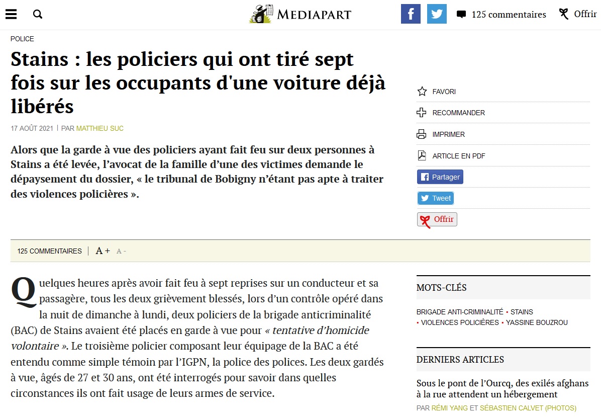 Sous la plume de Suc, Bouzrou dénonce cette "correctionnalisation" de l'affaire, porte plainte "du chef de tentative d'homicide volontaire mais aussi de faux en écritures publiques". Et demande le dépaysement du dossier hors de Bobigny car "le tribunal judiciaire de Bobigny [s'est] illustré à plusieurs reprises dans la presse pour sa mauvaise gestion d'affaires relatives à des faits mettant en cause des fonctionnaires de police". Des faits également relayés par l'AFP dans sa dépêche diffusée à la suite de l'article de Mediapart – relayée par Europe 1, Le Monde et France 3, entre autres. Mais ils n'ont fait l'objet d'aucune mise à jour des articles du Parisien, de Marianne ou d'Actu Seine-Saint-Denis – "on est passé à côté", regrette la journaliste du site web local, concentrée ce jour-là sur la couverture d'autres tirs de policiers à Rosny-sous-Bois. Qu'il soit dû aux moyens limités des rédactions, à la course à l'actu ou à une certaine porosité avec la communication de plus en plus élaborée des services de police, le "journalisme de préfecture" semble avoir encore quelques beaux jours devant lui.