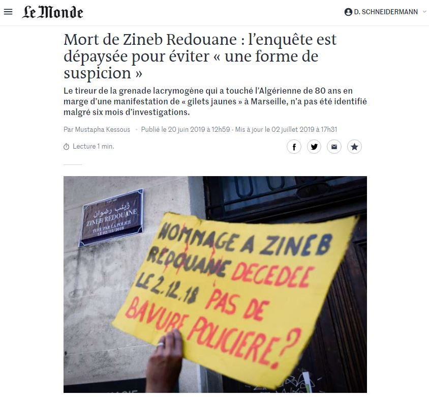 La police cherche-t-elle à faire obstacle à la vérité sur la mort de Zineb Redouane ? La question est plus que jamais d’actualité sept mois après la mort de cette Algérienne de 80 ans, morte à l’hôpital le 3 décembre dernier. Elle avait été atteinte en pleine tête, chez elle, à sa fenêtre, par une grenade lacrymogène lancée en marge d’une manifestation de Gilets jaunes, à Marseille, le 1er décembre. Sept mois après ce drame, et alors que le policier qui a tiré n’a toujours pas été identifié, l’enquête judiciaire est sous le feu des critiques.