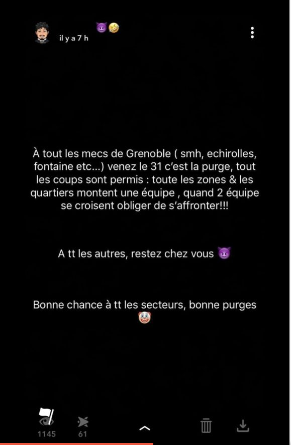 A l'origine de l’emballement médiatique, une "story "(ensemble de messages) postée sur le réseau social Snapchat par un étudiant grenoblois de 19 ans, comme l'a noté Numerama. L'un des messages annonce une "purge" pour la nuit du 31 octobre, incitant tous les quartiers grenoblois à "monte[r] une équipe". Quand deux d'entre elles se croisent dans la rue, "obliger [sic] de s'affronter!!!". "Tous les coups sont permis", précise aussi l'étudiant. Les messages Snapchat disparaissant rapidement après leur envoi, seul le snap suivant, dont la capture d'écran a tourné sur internet, est encore visible sur les réseaux sociaux.