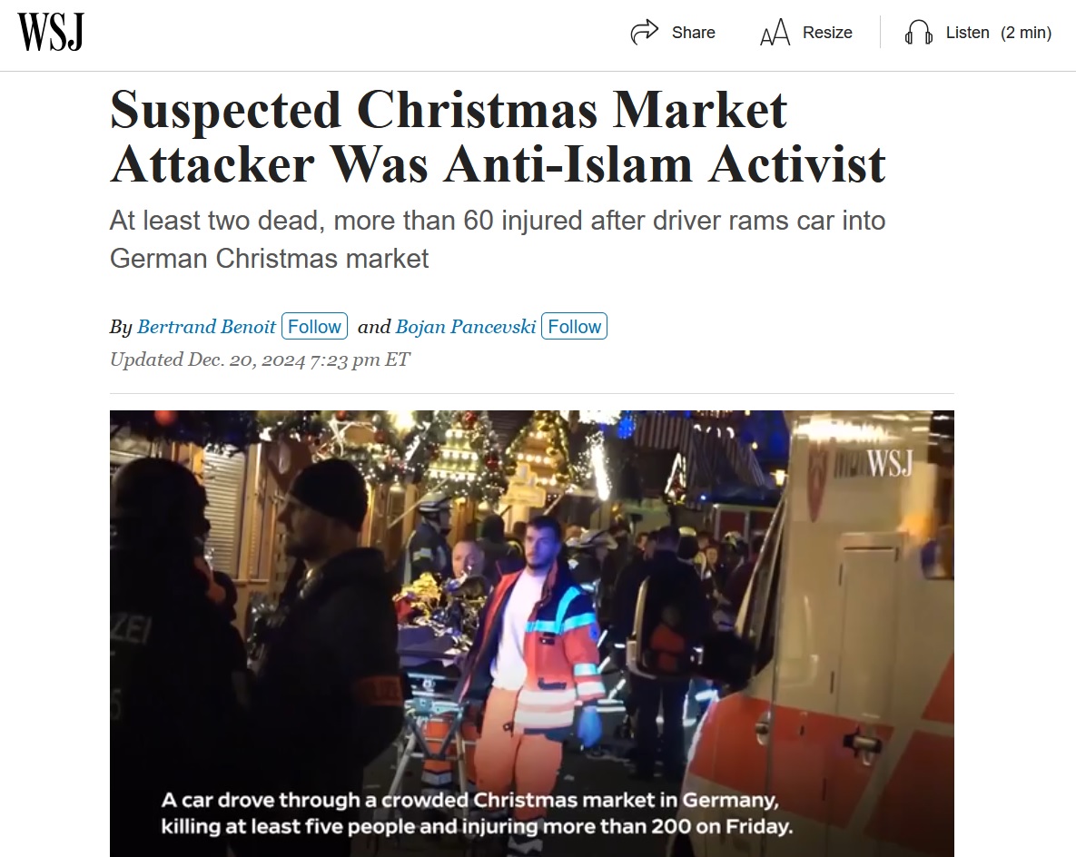 BFMTV, samedi 21 décembre, lendemain de l'attaque sur le marché de Noël de Magdebourg, en Allemagne. 7 h 31. "L'assaillant relayait sur les réseaux sociaux les publications de l'AfD, le parti d'extrême droite allemand", rapporte à l'antenne le correspondant de la chaîne info en Allemagne, Pascal Thibaut.