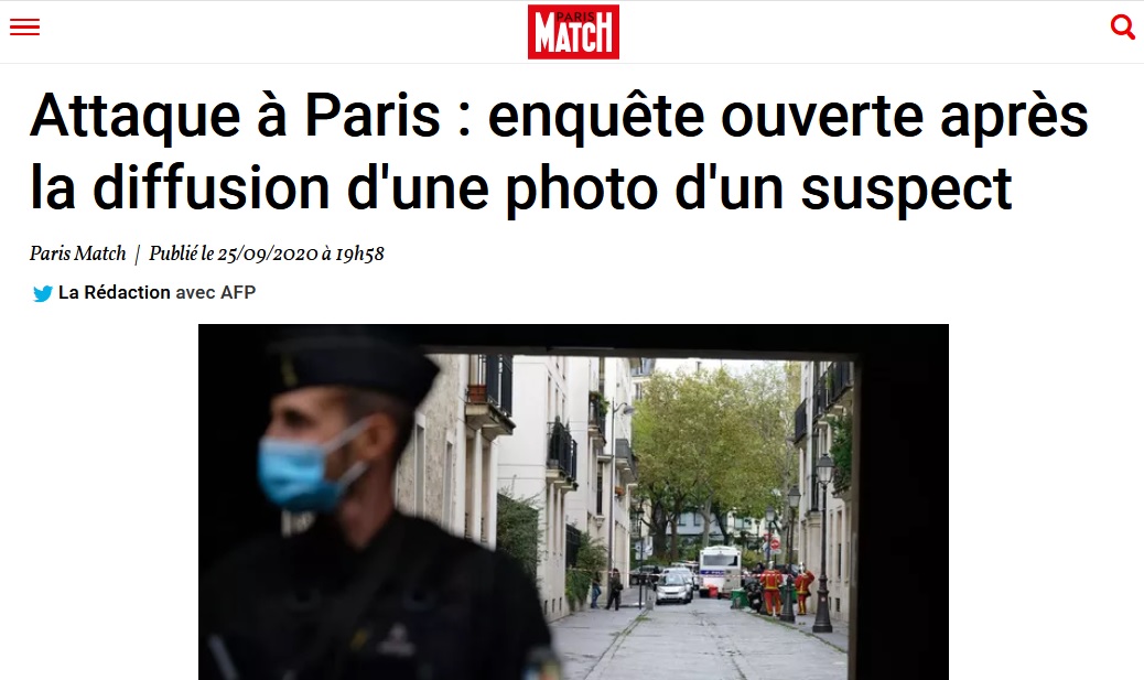 Un large couteau ensanglanté (une "feuille de boucher") posé sur les dalles d'un trottoir ; deux hommes filmés par la vidéosurveillance du métro ; un jeune homme assis par terre, capuche grise et baskets rouges, mains visiblement entravées ; le même en gros plan dans un local de police, avec quelques gouttes de sang sur le visage... Alors que policiers et gendarmes traquaient dans Paris le suspect de l'attaque au couteau ayant blessé gravement deux salariés de la société de production Premières Lignes, ce vendredi 25 septembre 2020, des photos circulaient dans les médias et sur les réseaux sociaux, moins de deux heures après l'arrestation (photos qu'ASI