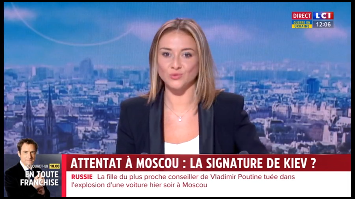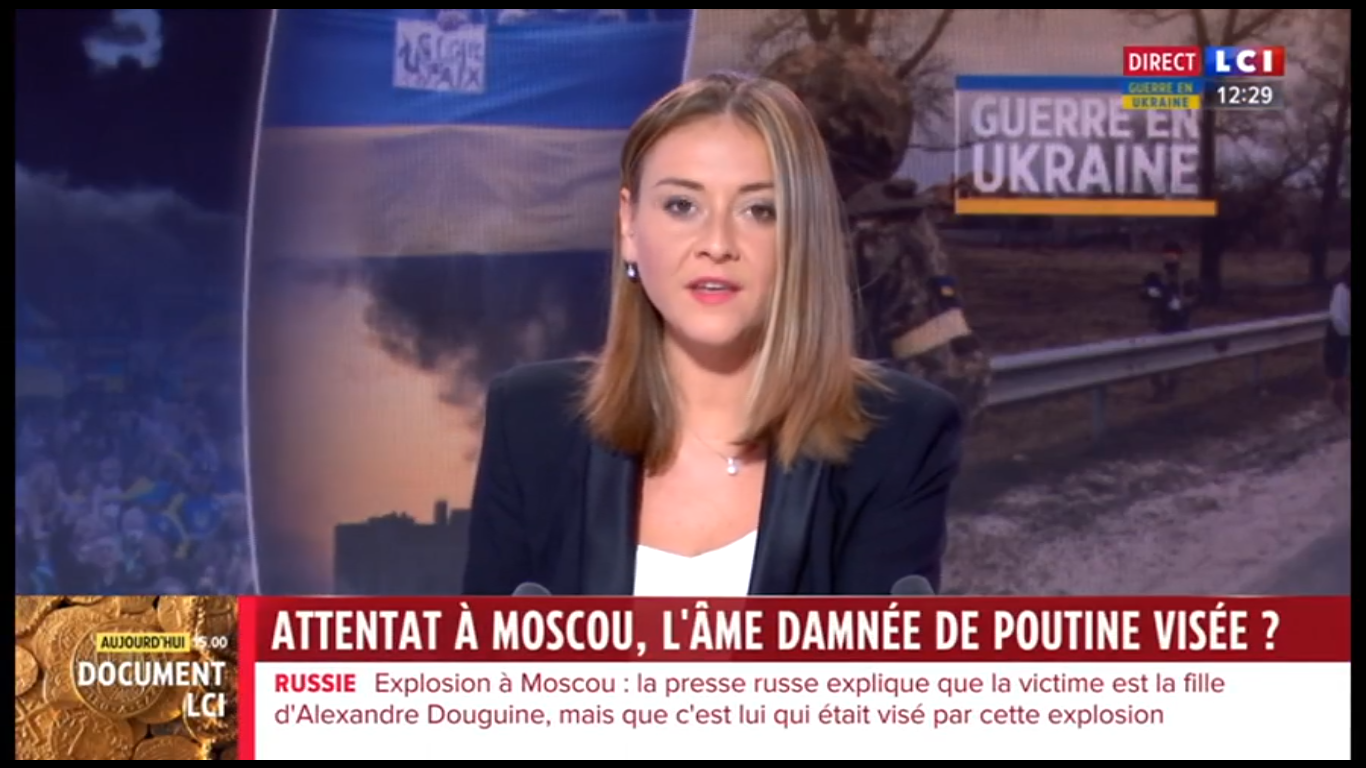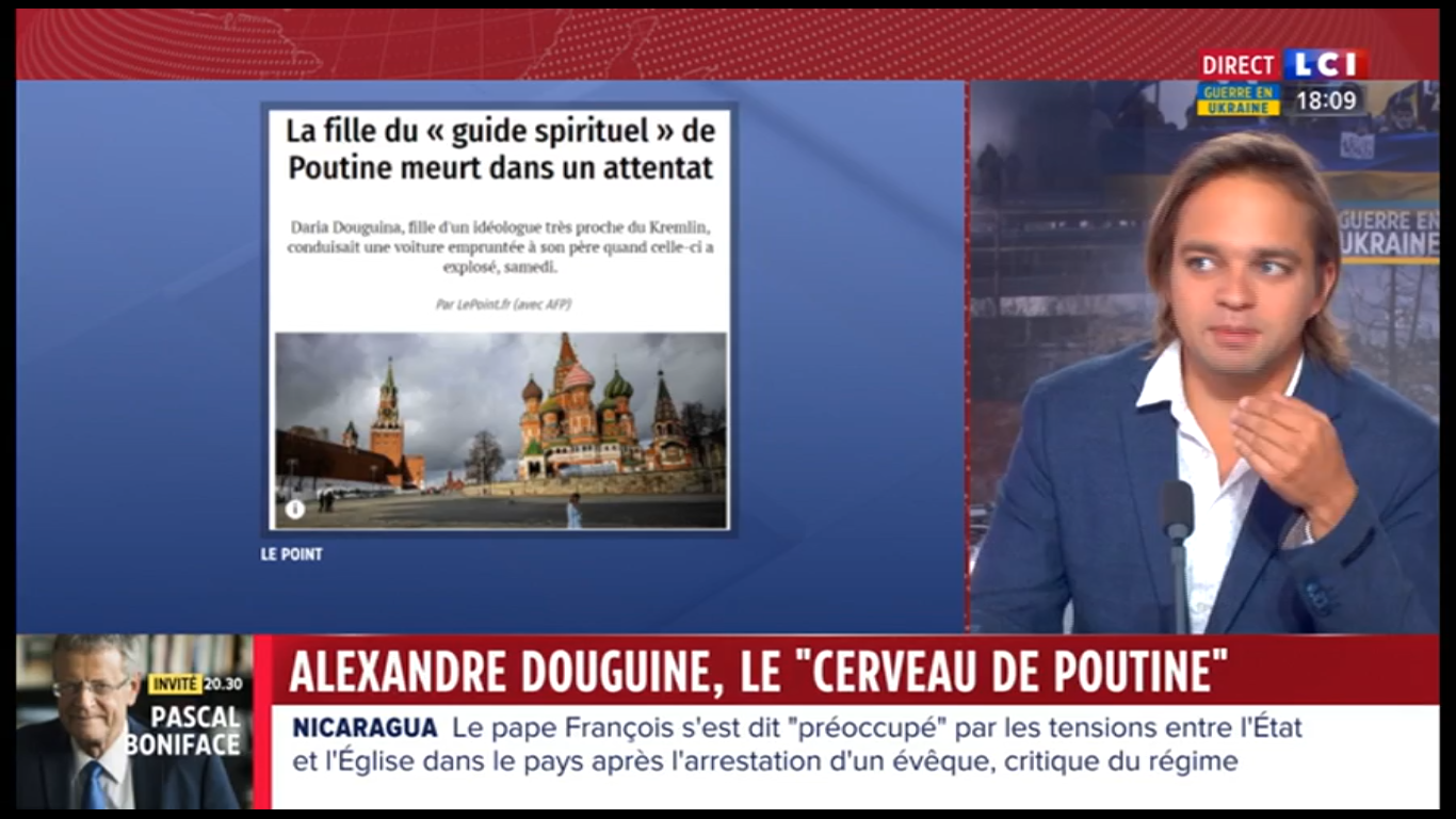"Alexandre Douguine, le cerveau de Vladimir Poutine, a échappé à une tentative d'assassinat", apprenait-on sur LCI vers 9 h 30 ce dimanche 21 août 2022. "C’est sa fille, Daria [...] qui est décédée après l’explosion du véhicule dans lequel elle prenait place", poursuit la journaliste. Un attentat contre une personnalité importante à moins de 40 kilomètres de Moscou, en pleine guerre en Ukraine : tout au long de la journée, cet événement fait les gros titres de la chaîne d'information en continu. Et LCI associe d'emblée l'attentat à la guerre, tout en présentant Douguine, idéologue d'extrême droite ultranationaliste, comme étant proche de Vladimir Poutine. Le viser serait attaquer le Kremlin : le suspect numéro un est donc le pouvoir ukrainien, pense la chaîne. Cette équation commode va tenir toute la journée malgré les trois duplex avec Paul Gogo, correspondant de plusieurs médias français à Moscou, et des spécialistes invités sur le plateau.