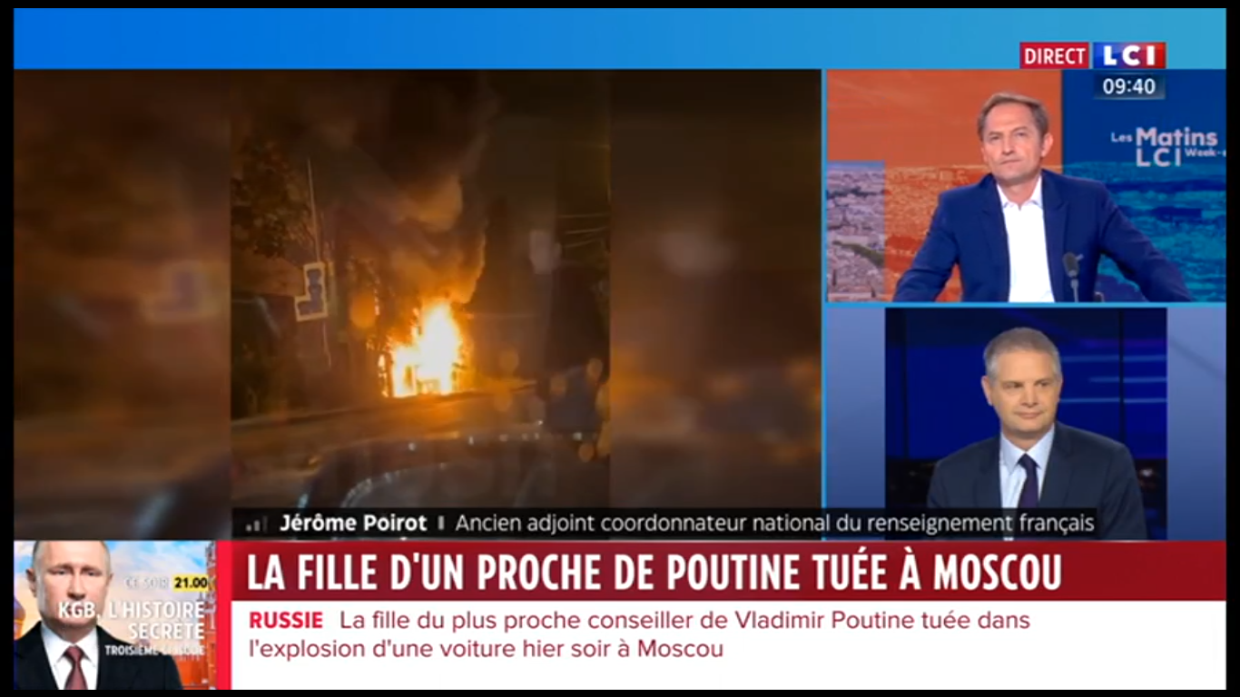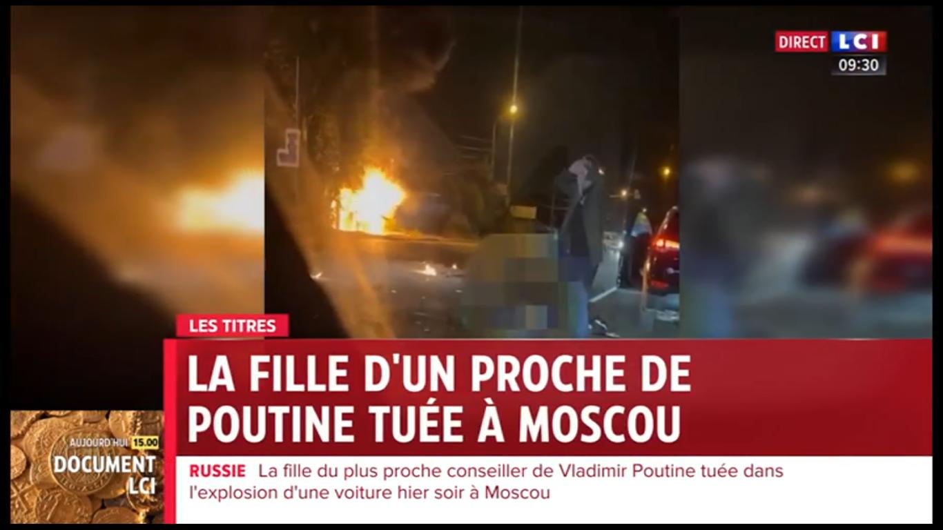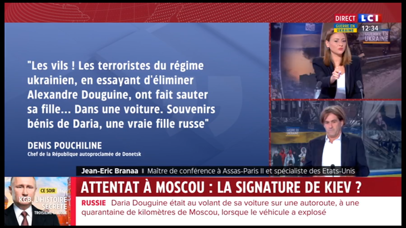 "Alexandre Douguine, le cerveau de Vladimir Poutine, a échappé à une tentative d'assassinat", apprenait-on sur LCI vers 9 h 30 ce dimanche 21 août 2022. "C’est sa fille, Daria [...] qui est décédée après l’explosion du véhicule dans lequel elle prenait place", poursuit la journaliste. Un attentat contre une personnalité importante à moins de 40 kilomètres de Moscou, en pleine guerre en Ukraine : tout au long de la journée, cet événement fait les gros titres de la chaîne d'information en continu. Et LCI associe d'emblée l'attentat à la guerre, tout en présentant Douguine, idéologue d'extrême droite ultranationaliste, comme étant proche de Vladimir Poutine. Le viser serait attaquer le Kremlin : le suspect numéro un est donc le pouvoir ukrainien, pense la chaîne. Cette équation commode va tenir toute la journée malgré les trois duplex avec Paul Gogo, correspondant de plusieurs médias français à Moscou, et des spécialistes invités sur le plateau.