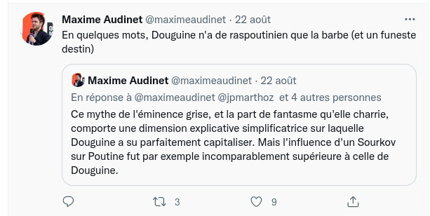 docteur en science politique et en études slaves, explique sur Twitter que Douguine n'a de Raspoutine (mystique russe influent, proche de l'épouse du tsar Nicolas II) que la barbe, et qu'il a su exploiter à son avantage le fantasme de l'homme de l'ombre qui tire les ficelles. De son côté, Nicolas Tenzer, haut-fonctionnaire et analyste politique, ajoute sur Twitter que Douguine est "infréquentable" pour le Kremlin tout en étant utile au "soft power" russe à l'étranger.