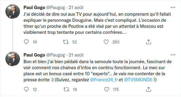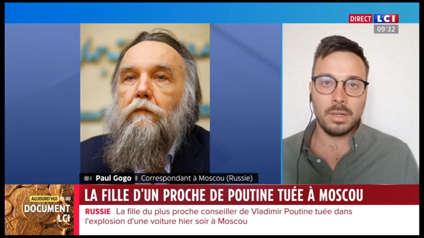 Lors de son premier direct, à 9 h 31, Paul Gogo explique que le père et la fille étaient invités en tant qu'intervenants à un festival et que, sur le retour, le père aurait finalement décidé de ne pas prendre la même voiture que sa fille pour rentrer. Celle-ci a explosé à 40 km de Moscou, tuant Daria Douguina. Il ajoute que pour la presse russe, c'est le père qui était visé, que des "propagandistes russes" accusent déjà l'Ukraine, mais précise que, par leurs discours violents et haineux, père et fille ont de nombreux ennemis potentiels en Russie.