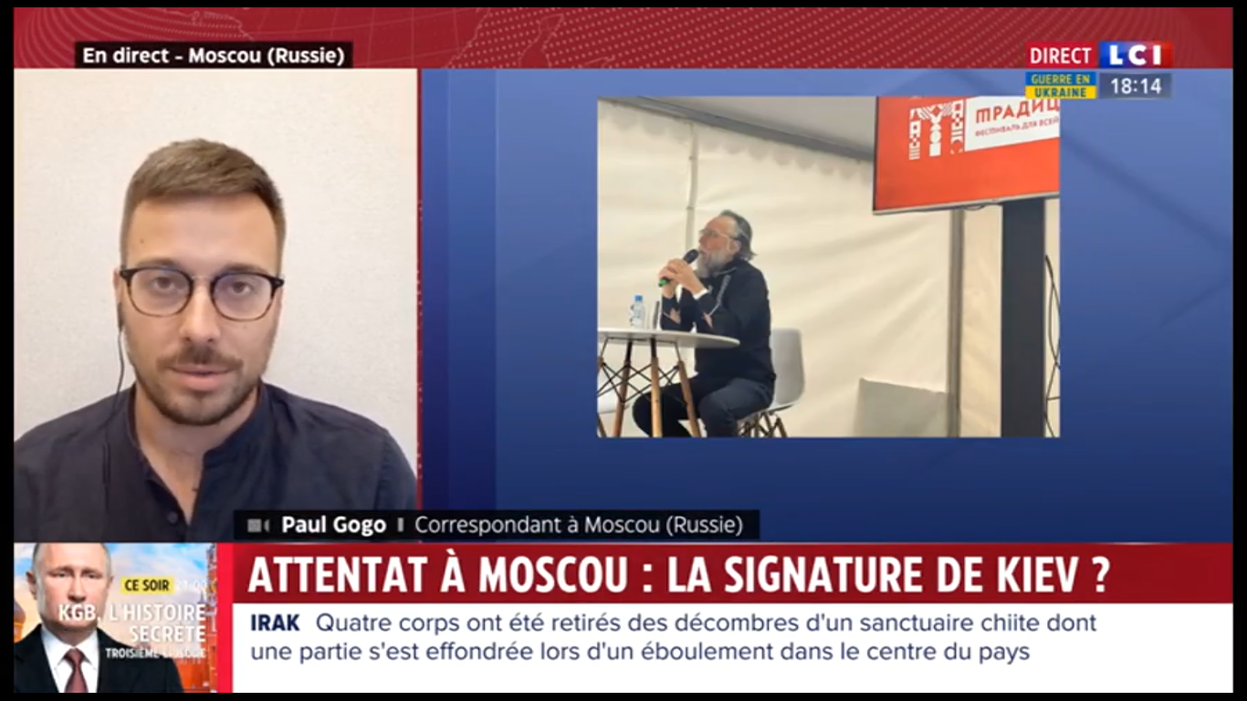 Pour sa troisième intervention de la journée, Paul Gogo fait le point sur la situation. On apprend que les caméras de surveillance du parking d'où sont partis le père et la fille Douguine ne fonctionnaient plus depuis deux semaines. Par contre, on ne sait toujours pas qui précisément était visé, pourquoi, et par qui. Quant au personnage de Douguine, Gogo précise alors : "Ce soir, on se rend compte effectivement que certains médias nationaux en parlent, mais traitent ça comme un fait divers [...] ce n'est pas traité de la même façon que chez nous, parce que Douguine reste quelqu’un qui n’est pas très connu en Russie, qui a quand même un peu fondé sa réputation sur son image à l’Ouest".