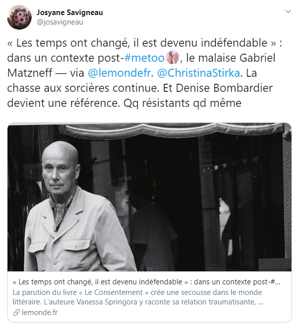 Aujourd'hui comme hier, Josyane Savigneau soutient Matzneff