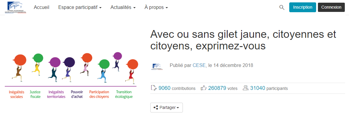 Six ans après sa création et ses grandes manifestations contre le mariage pour tous, les proches de la Manif pour tous semblent avoir gardé une grande capacité de mobilisation. Sur Internet, du moins. C'est ce que paraissent montrer les résultats de la dernière enquête en ligne menée par le Conseil économique, social et environnemental (CESE, organisme d'Etat composé de représentants du patronat, des syndicats et d'associations, ayant pour rôle de conseiller le gouvernement). Cette enquête, démarrée le 15 décembre et clôturée le 4 janvier à minuit, avait pour but de consulter les Gilets jaunes sur leurs revendications. Passée relativement inaperçue, elle a tout de même attiré 31 040 participants, qui ont formulé 9060 propositions, réparties en 10 catégories, et voté 260879 fois.