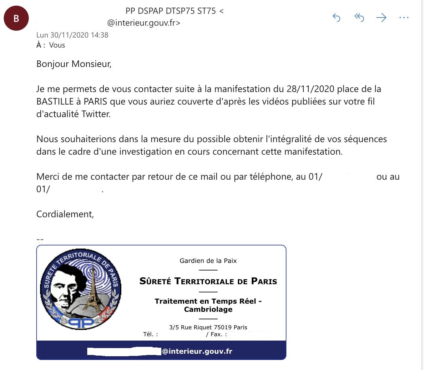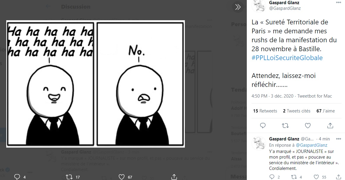 "C'était vraiment flippant," confie Yazid à ASI. "Je me suis senti sous pression." Il répond à son interlocuteur en s'interrogeant sur le "cadre légal" de la demande, notamment concernant le secret des sources. La Sécurité territoriale réplique : "Je ne saisis pas très bien quelles sources vous souhaitez protéger en invoquant le secret des sources, puisque vous êtes vous-même à l'origine des images que nous souhaitons récupérer." Et d'ajouter que la préfecture se tient à sa disposition pour "faire parvenir une réquisition". L'étudiant, qui n'a fait que publier quelques vidéos de la manifestation sur Twitter, s'inquiète. "Je me suis dit : mais dans quoi je me suis fourré ?" se rappelle-t-il. Prudent, Yazid contacte son école de journalisme et son syndicat, afin de ne pas faire de "faute déontologique". Il lui est alors conseillé de ne pas remettre ses rushes.