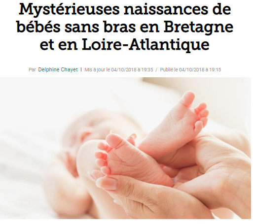 autour des sept bébés nés sans mains ou sans bras, entre 2009 et 2014, dans un rayon de 17 km autour de Druillat, dans l'Ain. Un phénomène observé également en Loire-Atlantique (trois naissances entre 2007 et 2008) et dans le Morbihan (quatre naissances entre 2011 et 2013), toujours dans un rayon restreint.