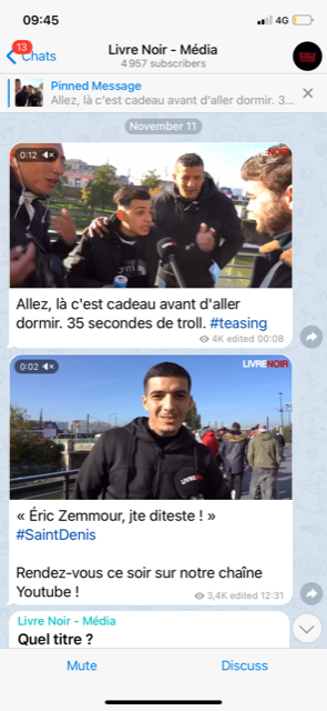 "Je vois bien ce que vous pourriez reprocher à ce reportage, soupire Tegnér. Mais peu importe ce que vous en pensez, on est allés sur le terrain, dans la Cité des 3 000, où plein de journalistes ne veulent pas aller. On a fait un truc qu'aucun média ne fait, on a des images fortes. On est pas là pour dire s'il y a un grand remplacement ou pas. On est là pour donner la parole aux gens qui vivent là-bas." Jordan Florentin affirme l'avoir fait avec "bienveillance" – à l'instar des interviews de spectateurs de Yassine Belattar, donc. Cette bienveillance semble cependant toute relative quand on s'attarde sur la boucle Telegram du média : Livre Noir