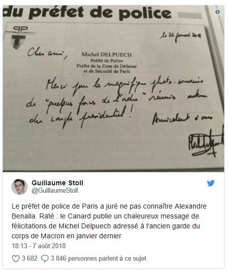 Avec la baisse des température aujourd'hui, et après avoir frôlé la surchauffe, TF1 et France 2 vont-ils trouver l’occasion de se pencher cette fois sur cette carte de remerciement du préfet Delpuech à son "cher ami" Benalla, publiée ce mercredi par le Canard enchaîné -qui révèle en outre que cette pièce n'a pas été versée au dossier ? Et ce alors que Delpuech avait affirmé devant les parlementaires ne pas vraiment connaître l’ex-charge de mission de l’Elysée.
