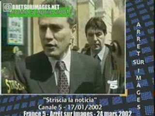 En 2002 d'abord, un an après sa réélection, il s'agissait de comprendre son influence sur les chaînes qu'il possédait, comme la Rete 4. Notamment en comparant le traitement d'une manifestation anti-Berlusconi sur la chaîne Rai 1 et sur Rete 4 pendant la campagne électorale. Comparez, ce n'est pas la même manifestation ! |