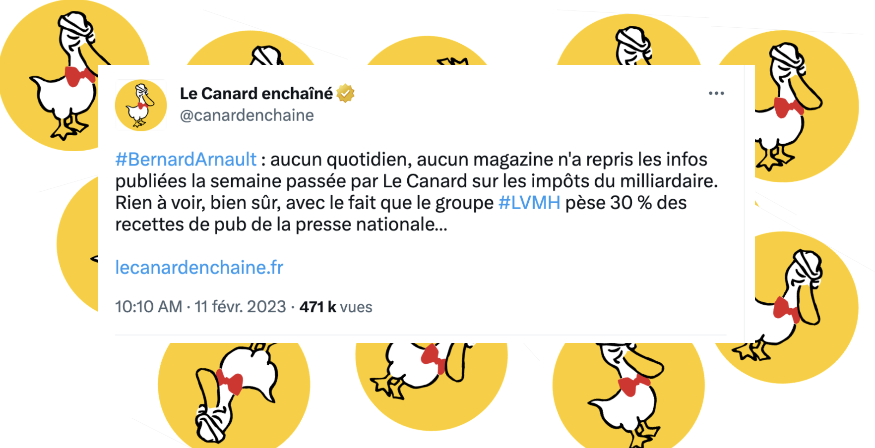 Le Canard enchaîné est vert. "La presse française sait se tenir. Aucun quotidien, aucun magazine n'a repris les informations du Canard sur la fiscalité sauvage qui frappe Bernard Arnault", s'est indigné (avec sa légendaire ironie) sa rédaction dans un billet, complété d'un tweet, dans son avant-dernière édition : "Rien à voir, bien sûr, avec le fait que le groupe LVMH pèse 30 % des recettes de pub de la presse nationale…" Une semaine plus tôt, l'hebdomadaire publiait un article sur la feuille d'impôt du milliardaire, propriétaire de LVMH. L'info principale révélée par le journaliste : le taux d'imposition de l'homme le plus riche de France, "moins de 14 %" sur la totalité de ses revenus (1,3 milliards d'euros), dont 18 % sur ses résultats directs et 12,8 % sur ses dividendes, équivaut grosso modo à "ce qui est appliqué à un couple sans enfant gagnant 150 000 euros par an".