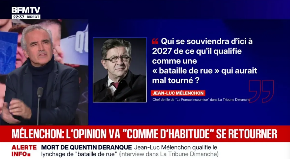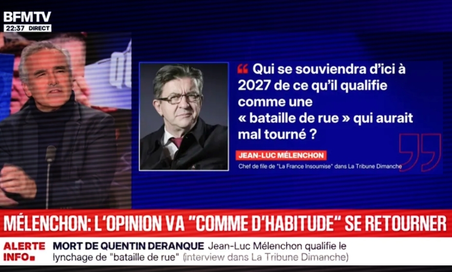 Au soir du samedi 21 février, s'affiche à l'antenne de BFM la citation suivante, attribuée "dans La Tribune Dimanche" à Jean-Luc Mélenchon, affirme la chaîne : "Qui se souviendra d'ici à 2027 de ce qu'il qualifie comme une «bataille de rue» qui aurait mal tourné ?".