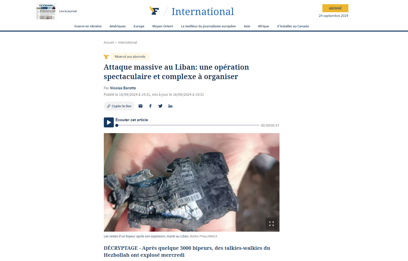 du groupe : "À 15 h 30, les bipeurs de centaines de personnes, faisant leurs courses, assises au café ou chevauchant leur scooter, ont explosé, après avoir, selon des témoignages, reçu un message. Pendant plusieurs heures, un ballet d'ambulances a déversé dans des hôpitaux, submergés, de Beyrouth, du sud du pays et de la plaine de la Bekaa, les blessés venus de fiefs du Hezbollah. Des victimes aux mains déchiquetées, certaines défigurées, d'autres blessées à l'aine ou à la jambe."