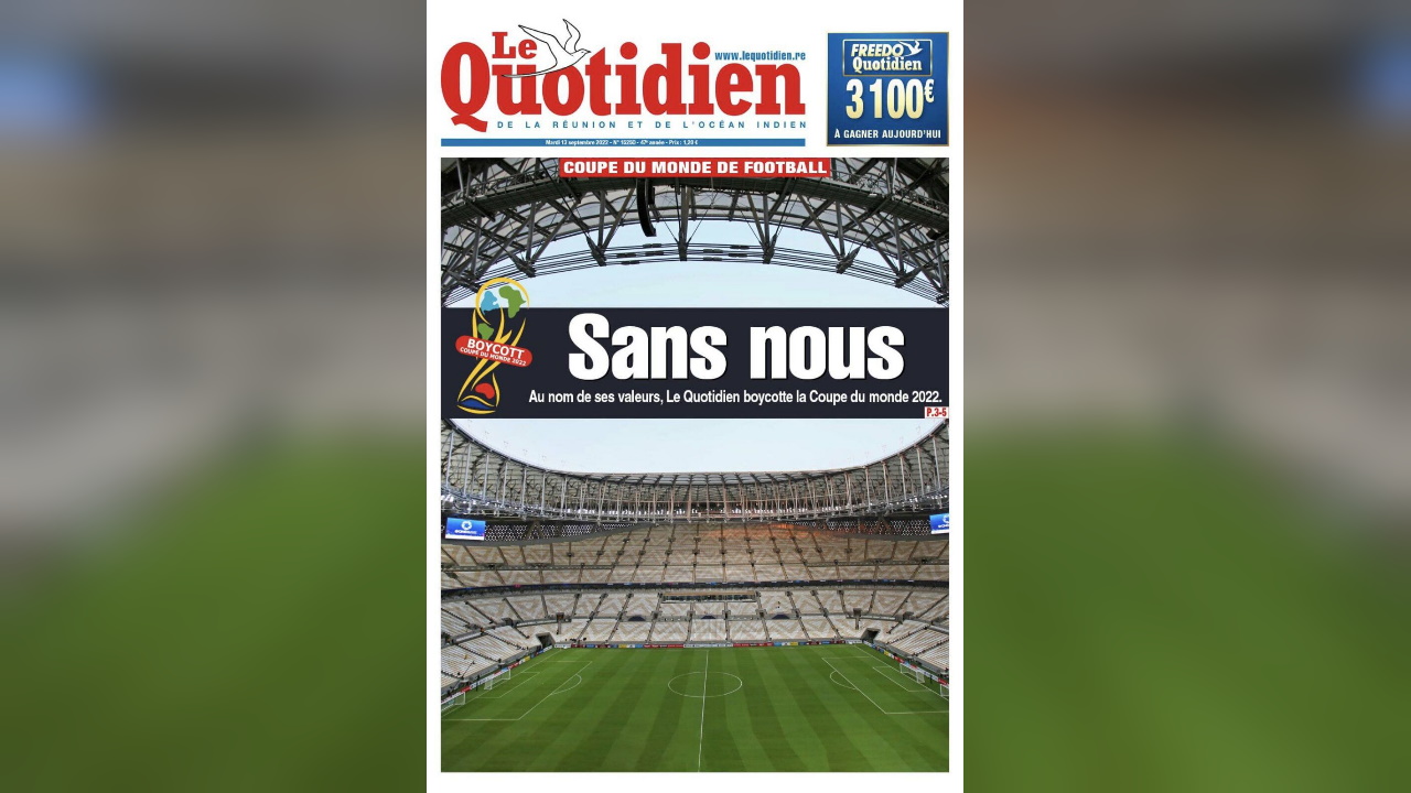 "Sans nous". C'est avec ces deux mots que le Quotidien de la Réunion a annoncé qu'il boycotterait la Coupe du monde de football masculin lancée le 20 novembre prochain. "C'est la première fois en France qu'un média annonce boycotter cet événement majeur de la planète foot", écrit l'AFP dans une dépêche reprise par la plupart des journaux nationaux. C'est dire l'engouement qu'a suscité la décision de ce quotidien tiré à 17 000 exemplaires. "On pensait avoir une réaction des journaux locaux mais pas ce retentissement médiatique", explique à Arrêt sur images Kevin Bulard, rédacteur en chef du Quotidien.