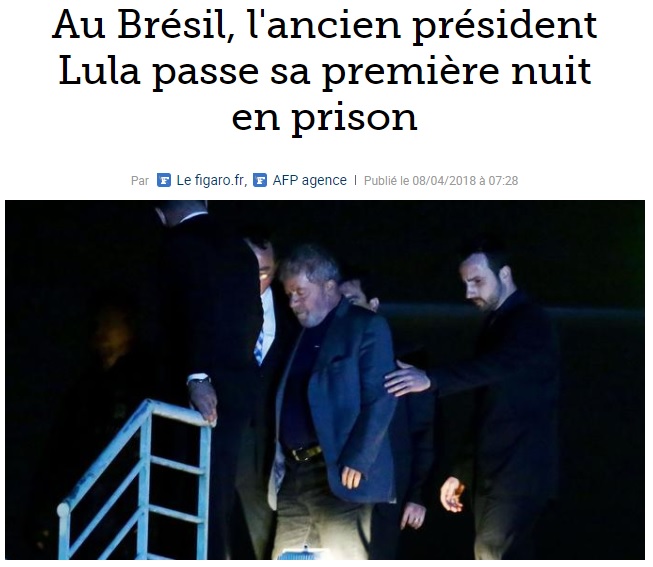 Ce sont deux images opposées de la même journée du samedi 7 avril durant laquelle l'ex-président brésilien Luiz Inacio "Lula" da Silva s'est rendu à la police pour purger sa peine de 12 ans de prison pour corruption. Dans l'une, massivement choisie par les médias ce matin du 9 avril pour illustrer la décadence de l'ancien chef de l'Etat, Lula est seul, encadré par la police, dans l'obscurité.