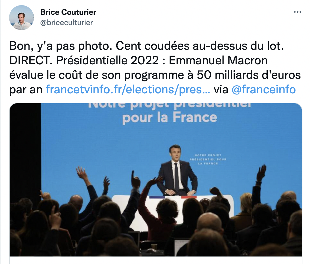 Pendant cette campagne présidentielle, certains ont eu des nuits agitées. "J'ai fait un cauchemar. Le Pen était à l'Élysée et Mélenchon à Matignon, tweete le 14 avril dernier, Brice Couturier. Et, dans la rue, il y avait l'émeute…" Ce message est accompagné d'une photo de CRS faisant face à un groupe d'émeutiers, avec derrière eux, la lumière d'un feu – sans doute celui de l'apocalypse. Mais heureusement, il y a le sauveur, le messie : Emmanuel Macron. Dans cette course à la présidentielle, Couturier trouve qu'il n'y "a pas photo" : le président sortant est "cent coudées au-dessus du lot […] Désolé, mais dans le lot proposé cette fois-ci, je n'en vois aucun autre".