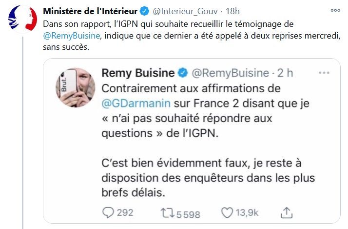 Dans les minutes qui suivent l'intervention de Darmanin, le principal intéressé réplique sans détour sur Twitter : "C'est bien évidemment faux, je reste à disposition des enquêteurs dans les plus brefs délais." Peu après minuit, le ministère de l'Intérieur lui répond par un tweet : "Dans son rapport (non rendu public contrairement à la synthèse, ndlr), l’IGPN qui souhaite recueillir le témoignage de Rémy Buisine, indique que ce dernier a été appelé à deux reprises mercredi, sans succès." De nouveau, le journaliste s'émeut. "Et c’est bien différent que de dire que je «n’ai pas souhaité répondre aux questions» comme l’affirme ce soir Gérald Darmanin sur France 2. Je suis à disposition dès demain, je me rendrai de ma propre initiative à l’IGPN pour enfin clore ce débat inutile."