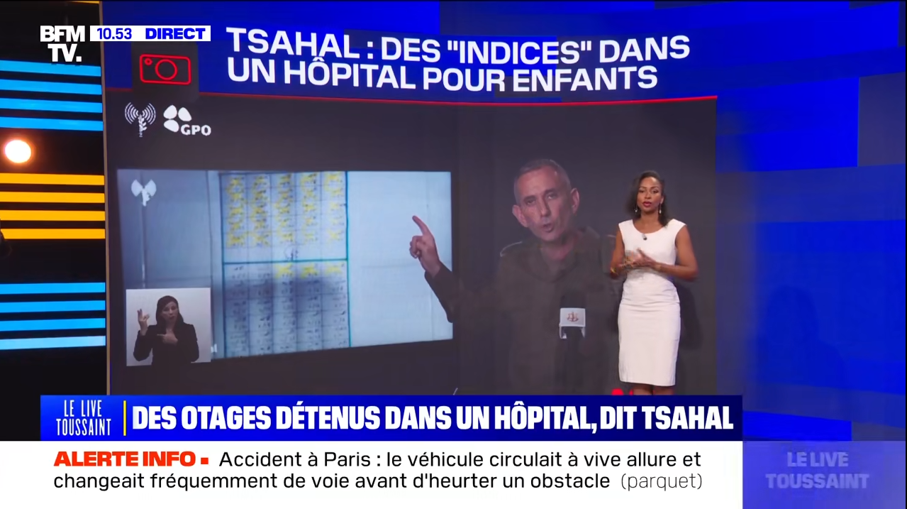 , il ne faut pas non plus compter sur les médias français pour les déchiffrer. Le 14 novembre, les matinales de toutes les chaînes d'info reprenaient les images-, souvent avec un usage du conditionnel de circonstance, mais sans remettre frontalement en doute l'affirmation israélienne selon laquelle le Hamas aurait utilisé cet hôpital pour y cacher des otages.