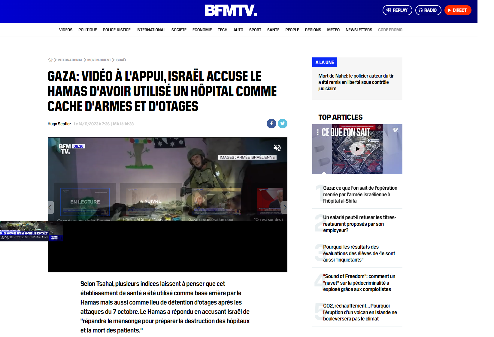 dans un sujet de la matinale, diffusé ensuite plusieurs fois dans la matinée, mais le sujet réutilise d'autres séquences de la vidéo du porte-parole Daniel Hagari et ne se penche pas sur la question du calendrier. L'article qui reprend le sujet sur le site de BFMTV, en revanche, est plus long, et s'appuie notamment sur la photographie tweetée par le lieutenant-colonel Avichay Adraee. "Selon Avichay Adraee,