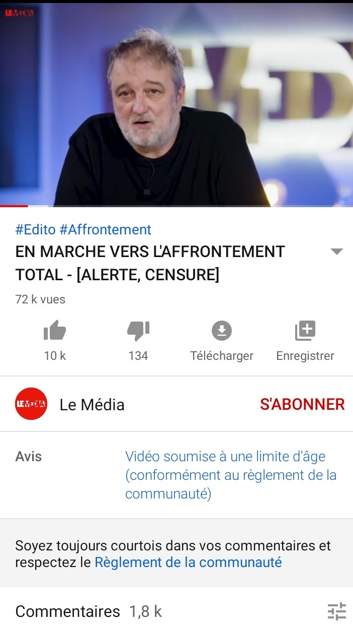 dit Robert, la vidéo est soumise à une "limite d'âge" : elle n'est plus visible par les utilisateurs qui ont moins de 18 ans. Concrètement, pour pouvoir accéder à la vidéo, il faut donc se connecter avec un compte Google/YouTube, contrairement à une vidéo normale qui peut se regarder sans être connecté. Puis, sous la mention "cette vidéo peut être inappropriée pour certains utilisateurs"