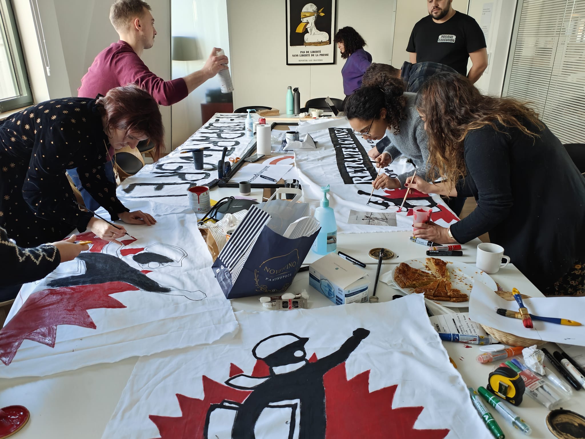 Les grévistes de Mediapart ont peint des banderoles et des drapeaux, très visibles en manifestation. Ces ateliers de préparation, "ce sont toujours des moments très joyeux"