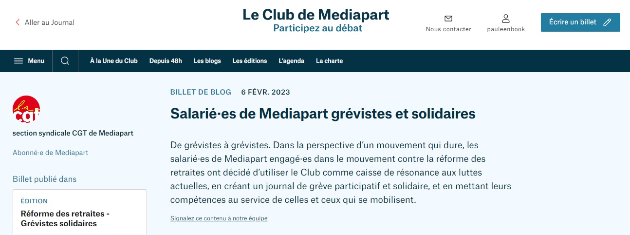 se sont elles aussi mises en branle dès le 19 janvier. La section syndicale CGT du média a annoncé la grève via un communiqué dans le "Club". En s'appuyant sur des articles produits par la rédaction, elle y rappelle que la réforme n'est "ni nécessaire, puisque le système n'est pas en péril, ni juste, puisqu'elle pénalise tout le monde, y compris les plus précaires et les femmes".