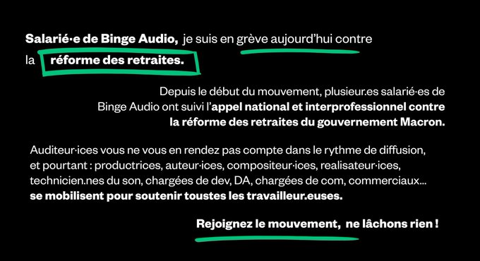 Afin d'informer les auditeurs et auditrices de Binge Audio, les grévistes du studio ont donc créé un visuel posté sur les réseaux sociaux : "Salarié·e de Binge Audio, je suis en grève aujourd'hui contre la réforme des retraites."