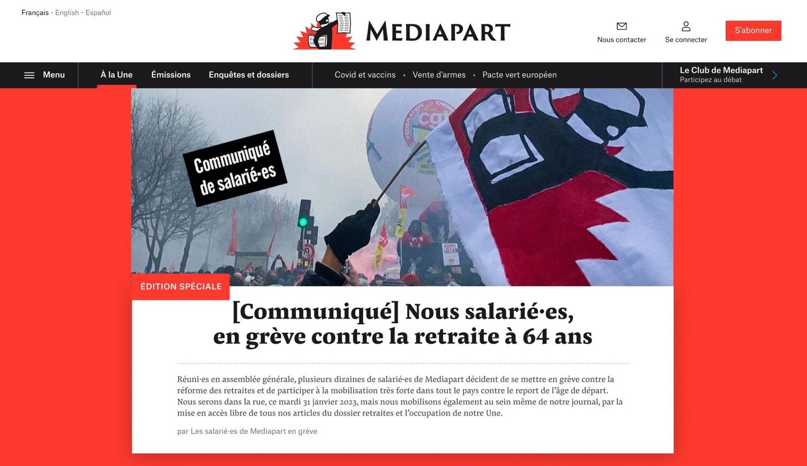 Si vous avez participé aux manifestations contre la réforme des retraites depuis le 19 janvier, vous y avez peut-être croisé des journalistes grévistes. Dans les cortèges parisiens, les salarié·es de Mediapart