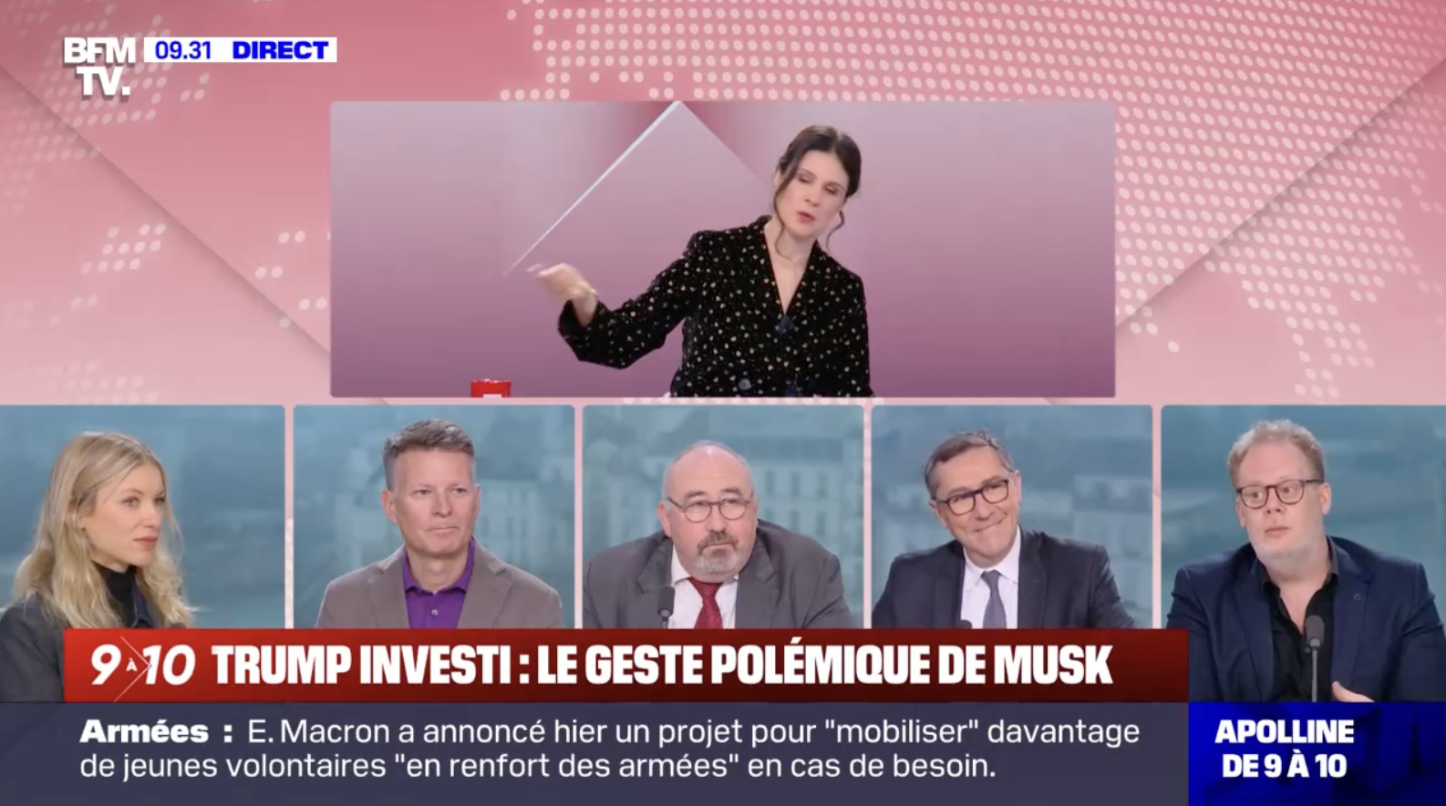 Sur BFMTV, la question a été une première fois posée à 7h45 à Luc Mary, auteur d'un livre sur Elon Musk. "C'est plus maladroit que volontaire", estime-t-il, avant de vite changer de sujet. À 9h19, Apolline de Malherbe revient sur le sujet, avec ses invités du jour : les journalistes Laurent Neuman, Stéphane Bureau, Frédéric Ploquin, et les éditorialistes Emmanuel Lechypre et Blanche Leridon, directrice éditoriale de l'Institut Montaigne.