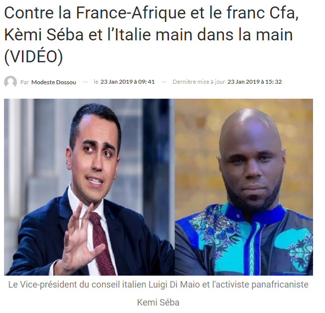 ". Des débats qui ne sont pas non plus à l'abri d'intox. Parmi les figures emblématiques, et controversées, de ce débat : Kémi Séba, militant panafricaniste, qui demande depuis des années l'abolition du Franc CFA, et dont on pointe également beaucoup la proximité avec Dieudonné ou le polémiste antisémite Alain Soral. Séba a vu deux de ses associations dissoutes pour incitation à la haine raciale, et a été relaxé en 2017 après avoir brûlé publiquement un billet de 5 000 Francs CFA au Sénégal. Il se revendique aujourd'hui être à l'origine des propos de Di Maio auprès du site d'information sénégalais Senenews