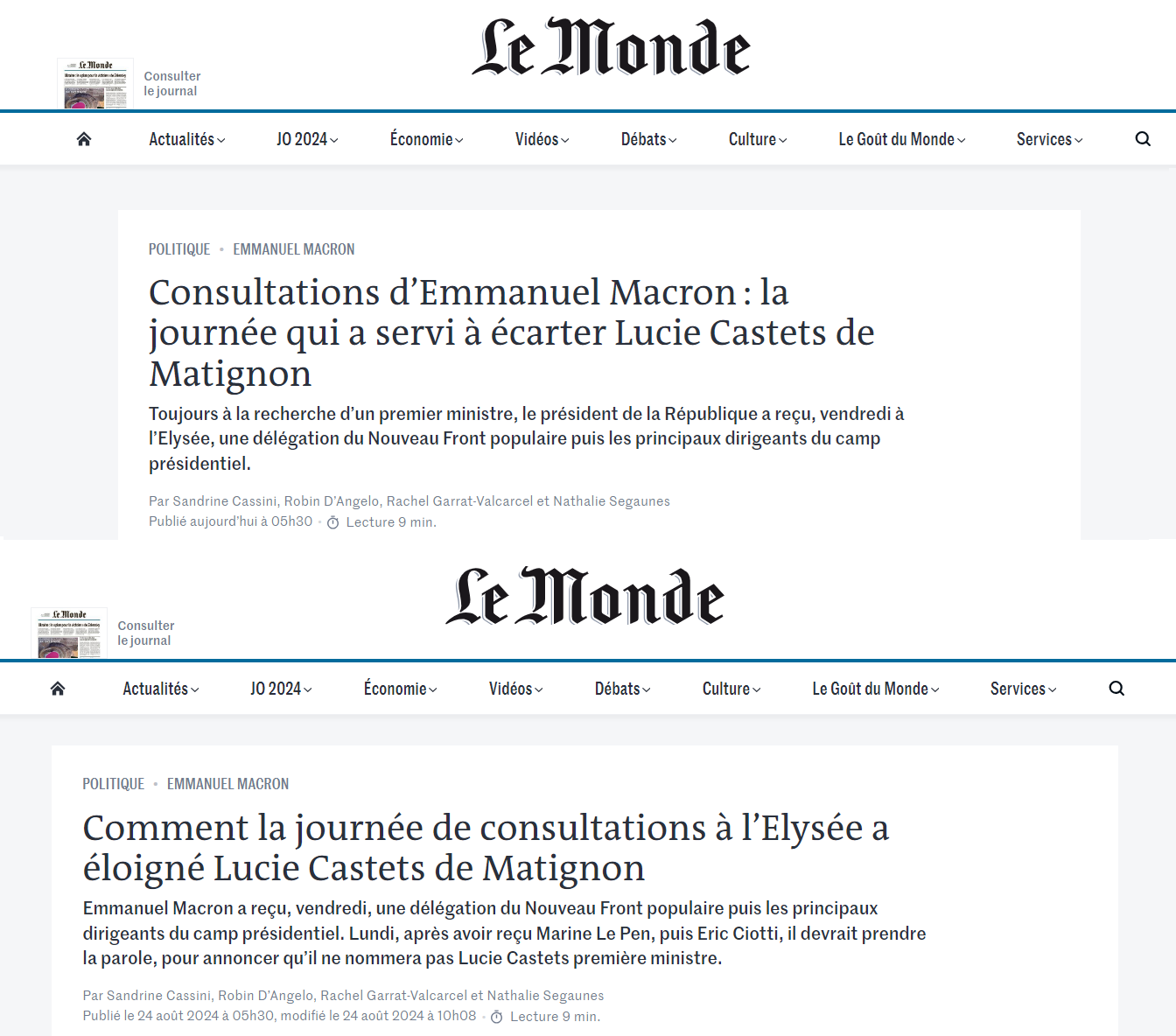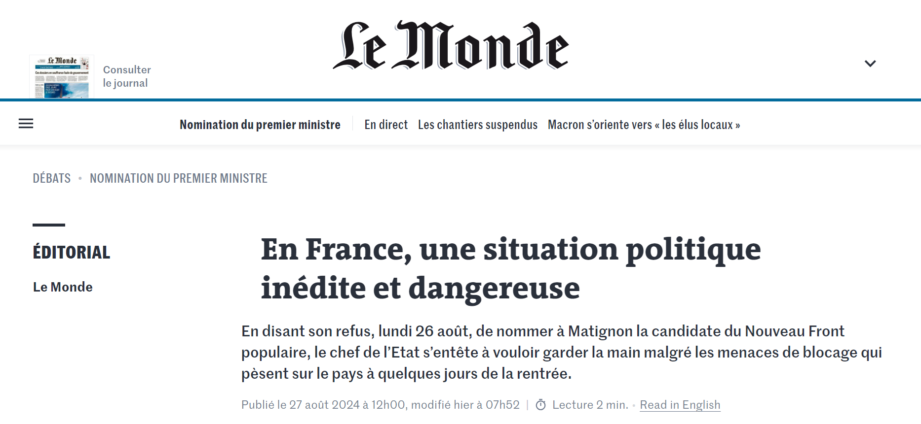 L'article qui l'a le plus outré est paru le 24 août, juste après la consulation de Macron avec le NFP. Le Monde