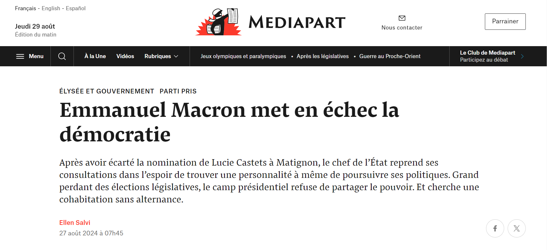 , à savoir que Macron n'a même pas daigné prononcer le nom de la candidate du NFP, Lucie Castets, lors de son allocution télévisée le 24 juillet ; ou encore l'absurdité de l'article du Monde