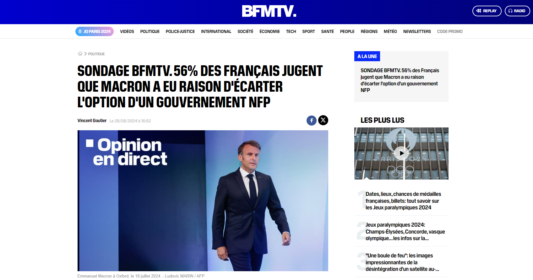 Le lendemain, la chaîne d'info publie un sondage commandé à Elabe :"56% des Français jugent que Macron a eu raison d'écarter l'option d'un gouvernement NFP"