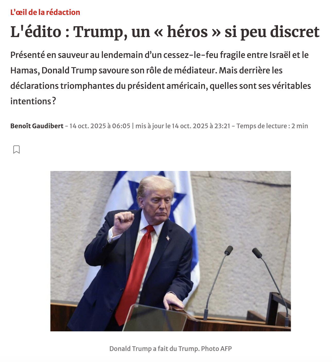 : "Le président américain qui est désormais le héros de tout un peuple, l'homme qui a permis la fin d'un «long cauchemar», deux ans après les massacres du 7 octobre et l'enlèvement de quelque 250 personnes. Et c'est un Donald Trump triomphant qui a pris la parole devant la Knesset, le parlement israélien, où il a été ovationné."