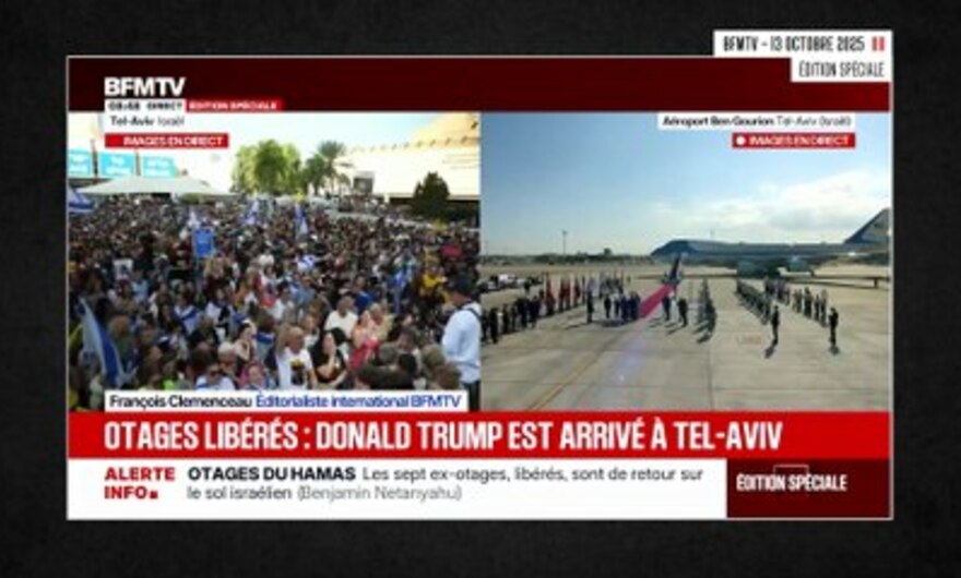 Toute la matinée du 13 octobre, alors que Trump était attendu en Israël et que les premiers détenus israéliens du 7-Octobre étaient libérés par le Hamas, les chaînes d'information françaises ont rivalisé de superlatifs pour le président des États-Unis.