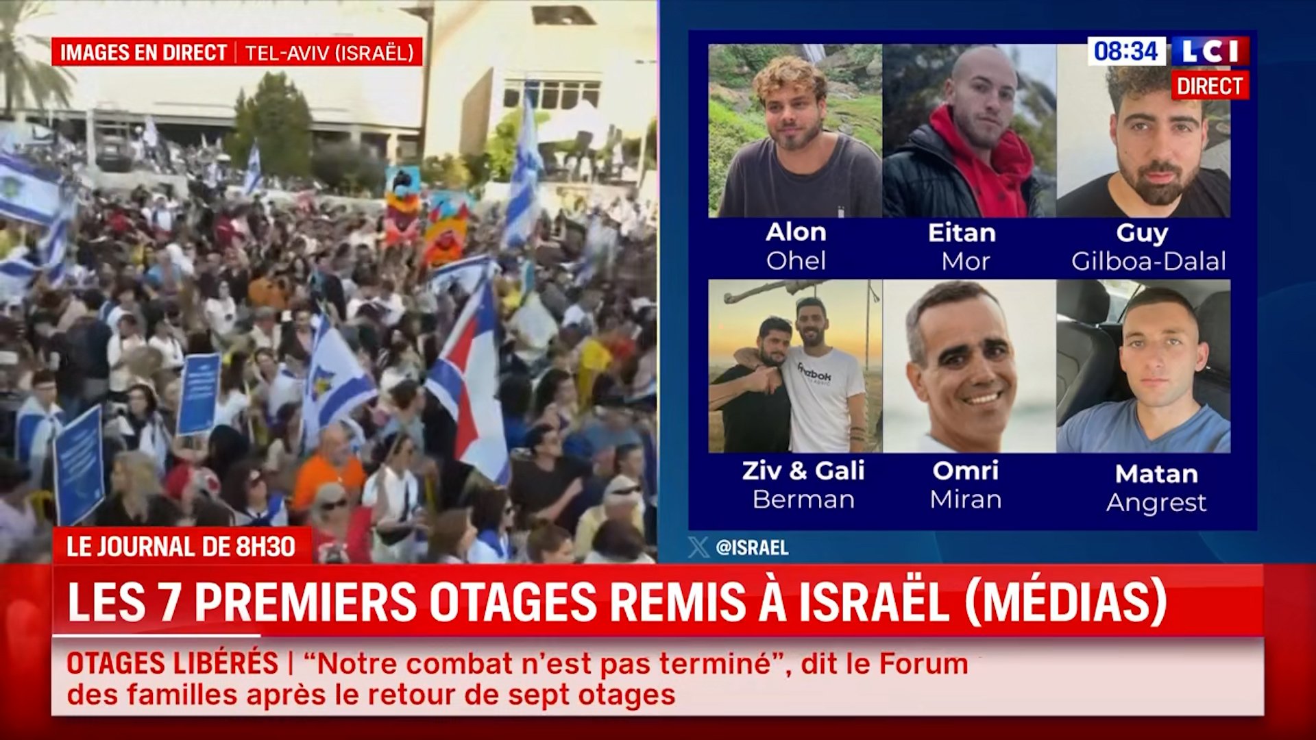 , et moult duplex et reportages sur place. Lesdits sept otages sont nommés, leurs photos montrées à l'écran de LCI, leurs familles interviewées. "Les otages israéliens, on connaît toute leur vie, le contexte, leurs noms, leurs visages, leurs familles qui attendent, leur histoire, ce qu'ils vont faire après, où ils sont blessés, tout ! Et les Palestiniens, rien du tout, c'est une foule indifférenciée"