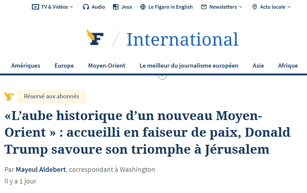 Sur France Culture, radio du service public, le discours est sensiblement le même. Les journaux du 13 octobre parlent d'un Trump qui est "acclamé à la Knesset"