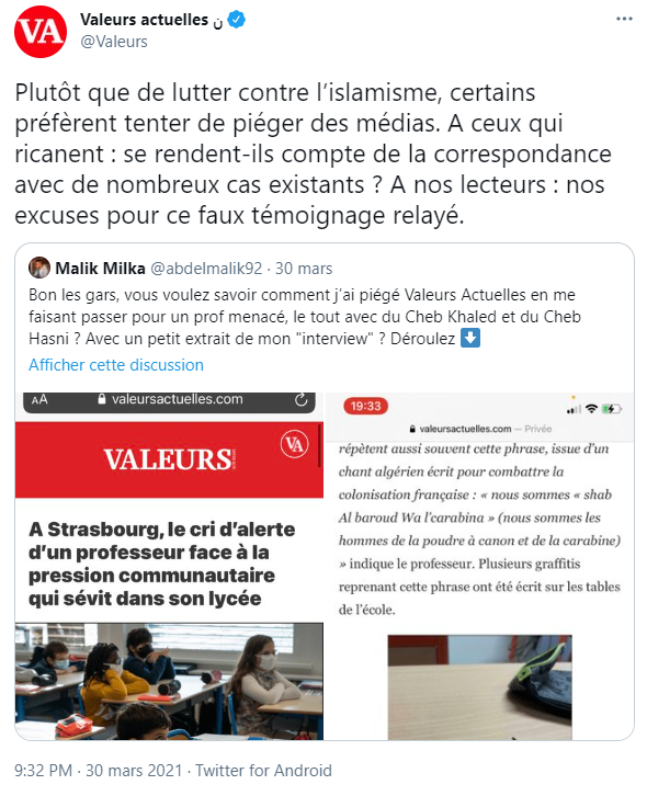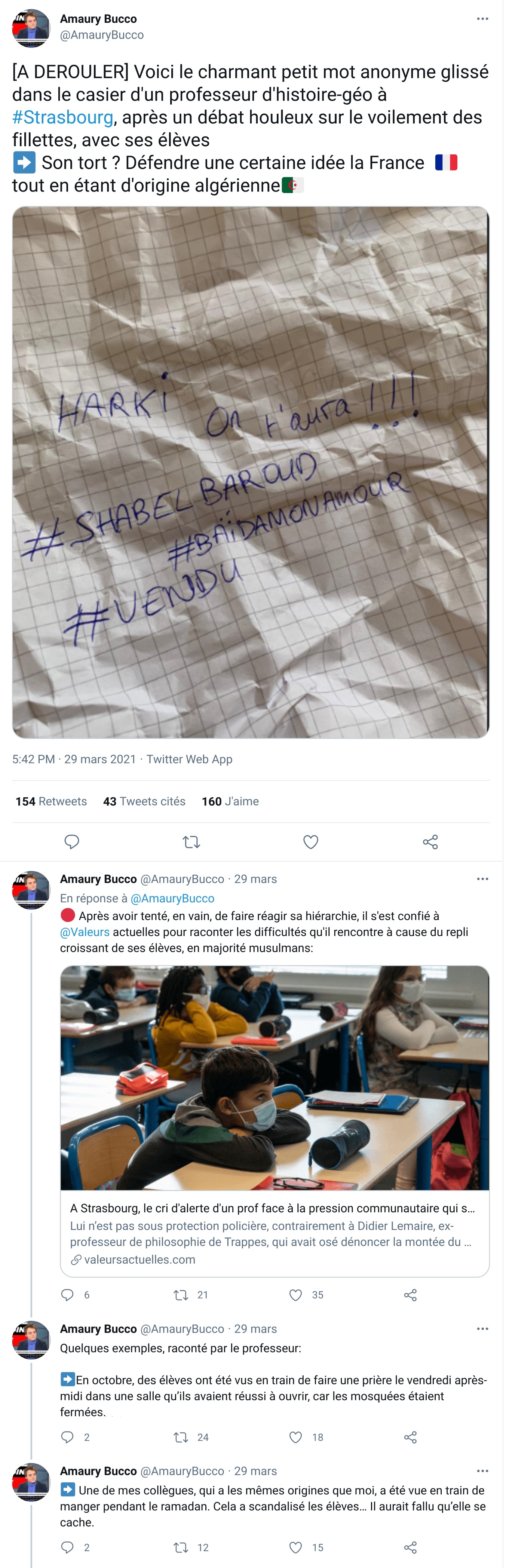 croit frapper un grand coup ce lundi 29 mars à 17h, en publiant l'interview d'un "prof de Strasbourg" qui "s'est confié à @Valeurs actuelles pour raconter les difficultés qu'il rencontre à cause du repli croissant de ses élèves, en majorité musulmans", comme le twitte son auteur, le journaliste police-justice Amaury Bucco.