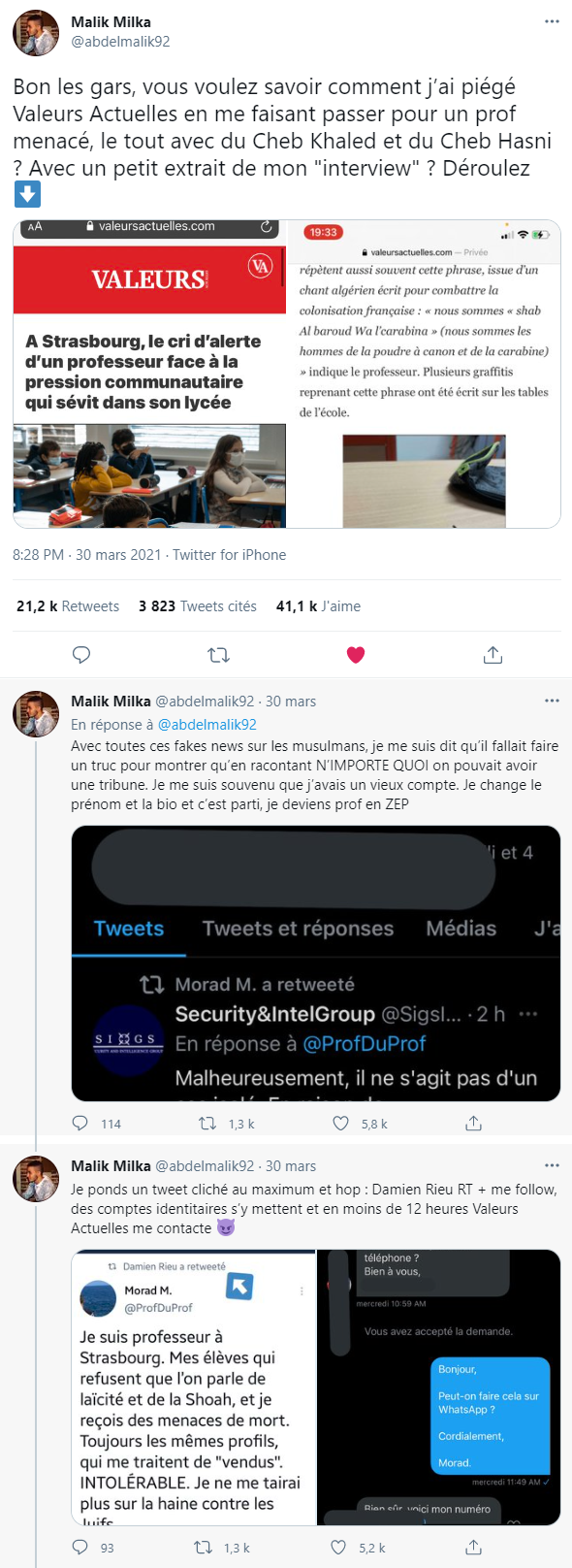 Malik, qui préfère ne partager que son prénom, explique être exaspéré par le "complotisme anti-musulmans" ambiant et avoir voulu "sortir quelque chose d'un peu gros, pour voir si ça prenait." "Avec toutes ces fakes news sur les musulmans, je me suis dit qu'il fallait faire un truc pour montrer qu'en racontant N'IMPORTE QUOI on pouvait avoir une tribune," a-t-il tweeté en se démasquant, le 29 mars au soir, après la publication de l'article de Valeurs actuelles qui était tombé dans le panneau.
