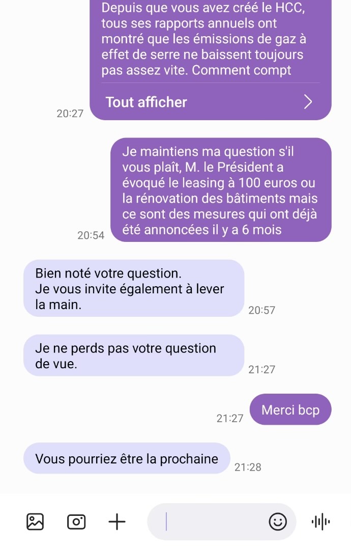Journaliste à Reporterre, Justine Guitton-Boussion, raconte la même histoire. "Un conseiller m'a demandé d'envoyer ma question par texto. Ce que j'ai fait. Honnêtement, je ne m'attendais pas à ce qu'elle soit sélectionnée. Mais un moment, on m'a dit que je serai la prochaine". Après avoir envoyé sa question, Justine Guitton-Boussion reçoit une réponse du conseiller : "Bien noté votre question. Je vous invite également à lever la main." Deuxième texto 30 minutes plus tard : "Je ne perds pas votre question de vue." Réponse de la journaliste : "Merci bcp". Dernier message reçu du conseiller : "Vous pourriez être la prochaine". Après 1 h 16 de conférence de presse, elle pose sa question, sur les émissions de gaz à effet de serre, concluant ainsi : "Quelle nouvelle politique écologique pouvez-vous nous annoncer ce soir? ". Nous publions les échanges ci-dessous.