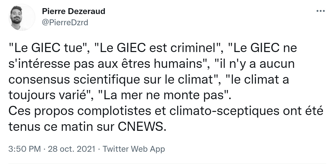 Il voulait "qu'on n'entende pas toujours les mêmes voix" et a dénoncé "une pensée unique, unique, unique" à propos du dérèglement climatique. Alors, Pascal Praud a invité non pas des climatologues du Giec, mais deux représentants du combat des lobbys contre les restrictions destinées à atténuer le dérèglement. Il "ne peut pas avoir d'avis sur le fond" mais agresse frontalement le seul invité qui ose émettre quelques réserves en évoquant, sacrilège, la problématique des déchets nucléaires. Il s'indigne du fait que les paroles favorables au nucléaire soient absentes du débat national (c'est faux), tout en citant dans la même respiration Nicolas Sarkozy, Emmanuel Macron et tous les présidents de la République qui, c'est bien connu, sont censurés par les médias. Bref, on a regardé L'Heure des pros "spéciale écologie" diffusée ce 28 octobre sur CNews, à quelques jours de la COP26 – un débat repéré par le journaliste Pierre Dezeraud, qui ne s'est pas privé d'écrire tout le mal qu'il en pensait sur Twitter.